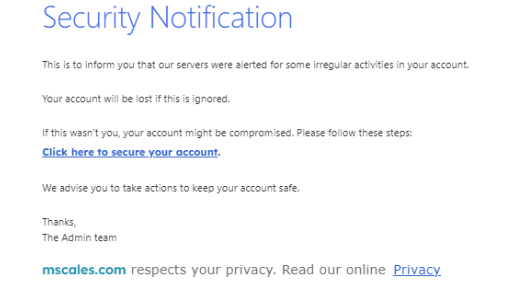 A new phishing email mentions security-related issues and has been sent from the address admin@mscales.com, which is not an email address we use at mScales. Below is a screenshot of the message for reference.